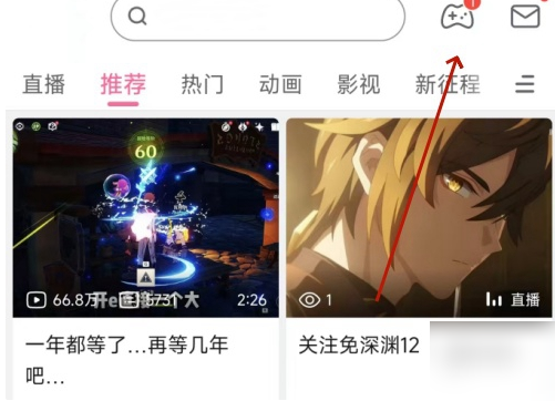 第一步:登录哔哩哔哩网站,在页面右上角区域找到游戏中心入口