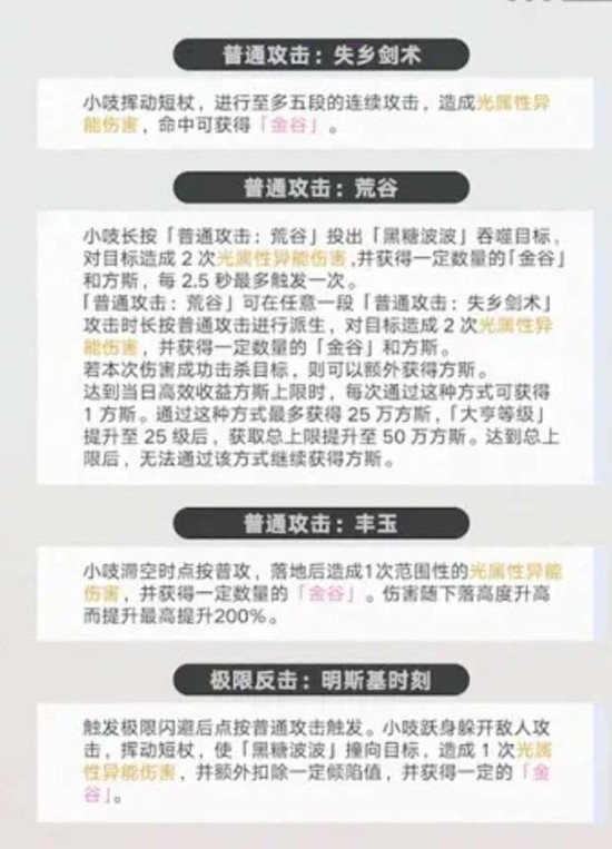 小吱挥动短杖进行至多五段的连续攻击,造成光属性异能伤害,命中可获得金谷。这是小吱最基础的输出手段,通过连续攻击积累资源。