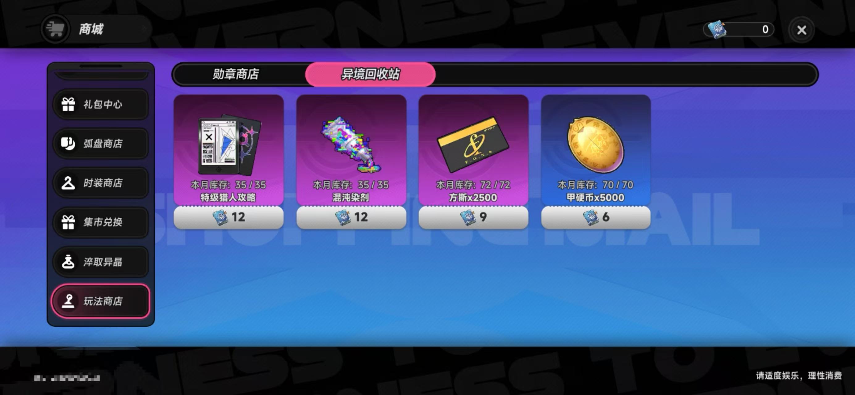 异境回收站位于游戏商城界面底部,进入商城后下滑至末位选项“玩法商店”,点击进入后选择第二项即可直达。需注意的是,所有兑换行为均依赖“异境代币”,该货币无法直接购买,仅能通过提升角色战力、完成高难度异境挑战后稳定产出。战力达标后,代币获取效率显著提升,为后续资源兑换奠定基础。