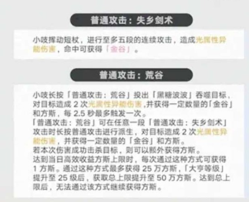 在「失乡剑术」任意一段攻击过程中长按普攻,可即时派生「荒谷」——投掷黑糖小编进行范围吞噬,造成两段光属性伤害,并同步获得金谷与方斯。该派生不依赖攻击段数完成,实现零帧衔接,大幅提升连招自由度与资源获取密度。此机制是小吱区别于其他角色的核心操作特征。