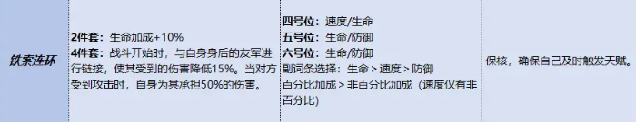 首选锦囊推荐为【铁索连环】。该锦囊不仅契合郭嘉驱散敌方关键增益的战术定位,更可强化其作为队伍枢纽的核心功能。两件套提供10%生命值加成;四件套激活后,战斗开始即自动与后排队友建立连环链接——使队友所受伤害降低15%,且当敌方对我方单位发起攻击时,郭嘉可主动承担50%的原始伤害,显著优化团队承伤分布。此配置下,郭嘉不再仅是辅助位,更是战局节奏的调控支点。
