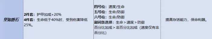 第三种高适配方案是【坚如磐石】。该锦囊聚焦于危局生存强化:两件套提供20%护甲加成;四件套进一步激活“低血量减伤”机制——当郭嘉生命值低于40%时,所受伤害降低25%。这一阈值设计精准覆盖其技能释放后的脆弱窗口期,大幅提升极限反打与拉扯空间。副词条选择上,“生命”与“速度”的权重明显高于“防御”,前者保障容错底线,后者加快技能循环节奏。