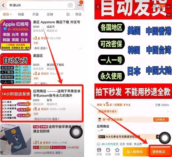 付款时选择中国t湾地区选项并确认支付。交易完成后联系店铺客服,获取购买的苹果ID账号信息。