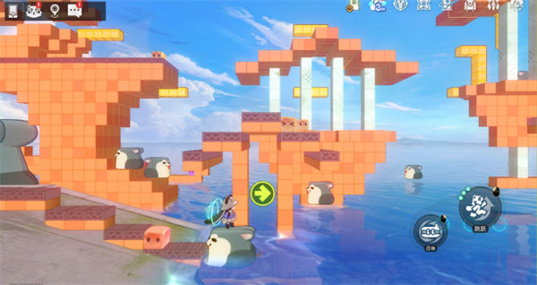 一直向右走到图示位置站在狗头上,召唤小帮手不要动,在水面上滑一段距离获得成就“划水就是上班”