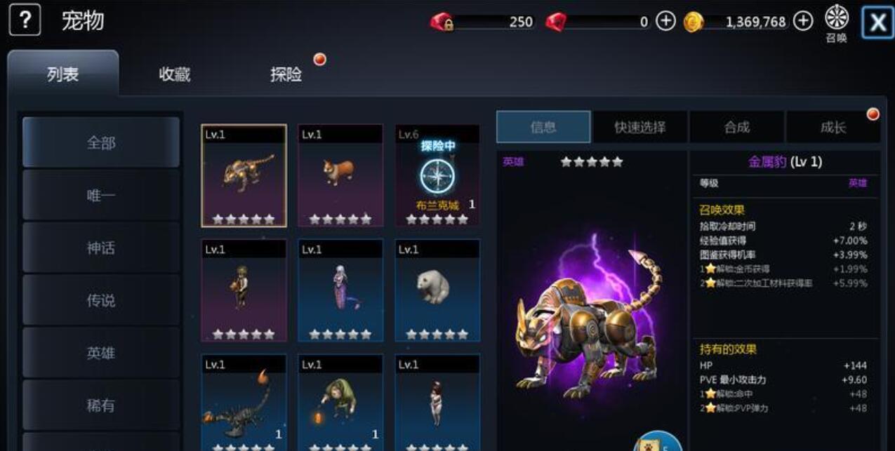 养成流程高度简化,支持快捷栏自由切换不同宠物出战。低阶个体可通过合成升阶为更高品质形态;重复获取的同类型宠物可作为材料用于主力宠物的经验喂养,实现资源高效转化与战力集中提升。