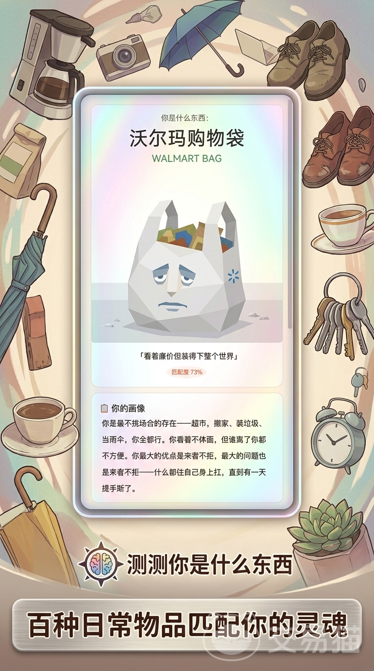 测试结果基于多维选项组合生成,共涵盖27种差异化物品人格标签,如“拿捏者”“卧草人”“多情者”等,兼具网感张力与情绪共鸣。结果页采用拟人化解析语言,融合轻幽默与当代青年语境,增强分享意愿。支持一键生成专属结果图,便于在主流社交平台快速传播。