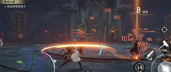 上去之后,就会碰到虎啸堂弟子,这里是真正的挑战。如果打不过,可以喊好友一起来。没有固定队友也没关系,界面上有个呼叫功能,可以招陌生玩家帮忙。